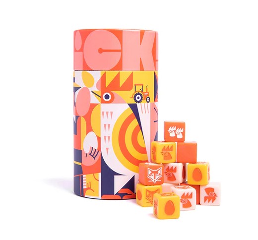Crack open the tube. Roll Chickens to score, hatch dice to push your luck, and avoid Foxes of you'll bust. Don't be a Chicken; roll them dice!