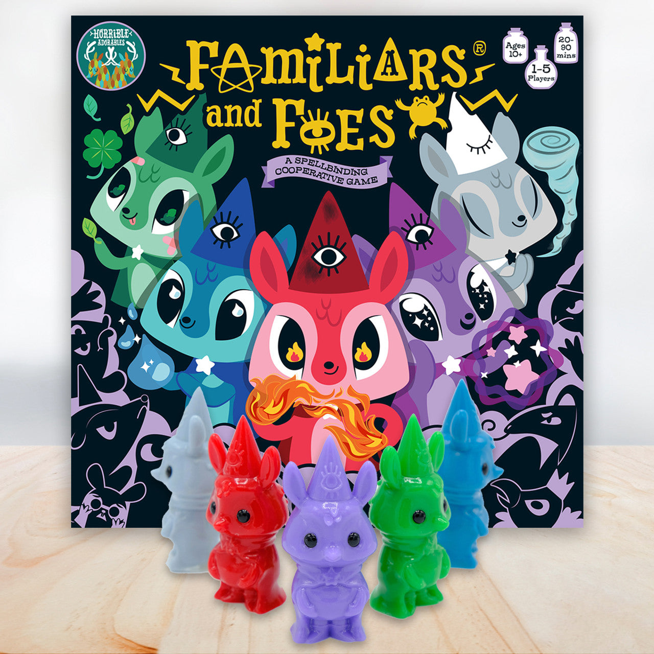 Familiars and Foes is a 1 to 5 player cooperative style game. You take the role of a young spell slinging Familiar trying to rescue your witches and wizards from a horde of evil Foes. Your character begins as a base elemental Familiar (Earth, Air, Water, Fire, or Aether) and you must work to fully evolve your Familiar by completing a series of training tasks. The game is played in four waves that progressively increase in difficulty. New sets of Foes are revealed with each wave of battle that must be defeated to save your coven. The game is won when all the Foes have been defeated, all the witches and wizards have been rescued, and at least one Familiar is still standing.