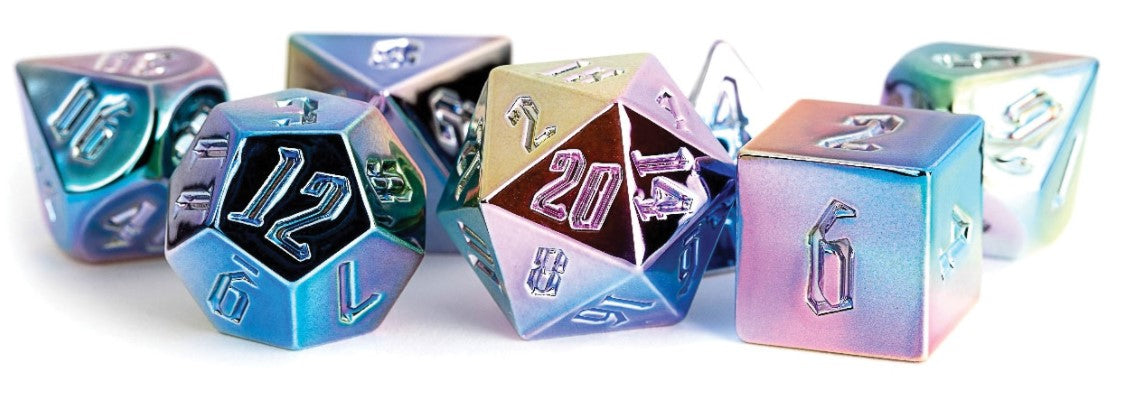 Rainbow Aegis Dice are a molded acrylic set, electroplated with a durable aluminum shield. This set offers the utility of plastic dice, with the beautiful look and feel of metal dice.