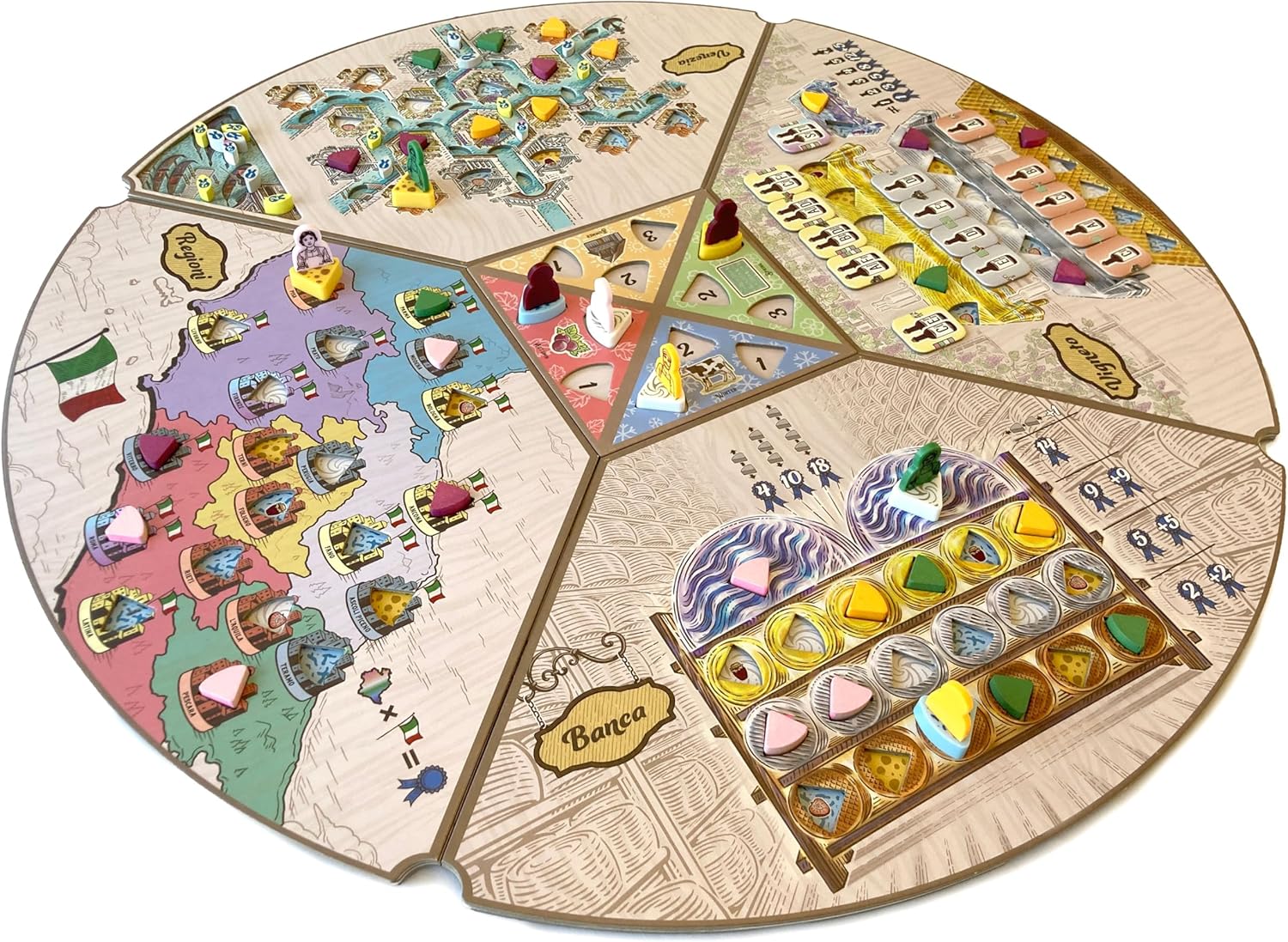 Formaggio is a simultaneous worker-placement game where players place Workers to make cheese and gather resources from the quadrant of the board facing them. Once all players have placed their Workers, the board rotates, aging any cheese that was made, and presenting each player with a new quadrant to place Workers into. Score Prestige Points by selling cheese to the four locations, and by efficiently managing and upgrading your creamery.