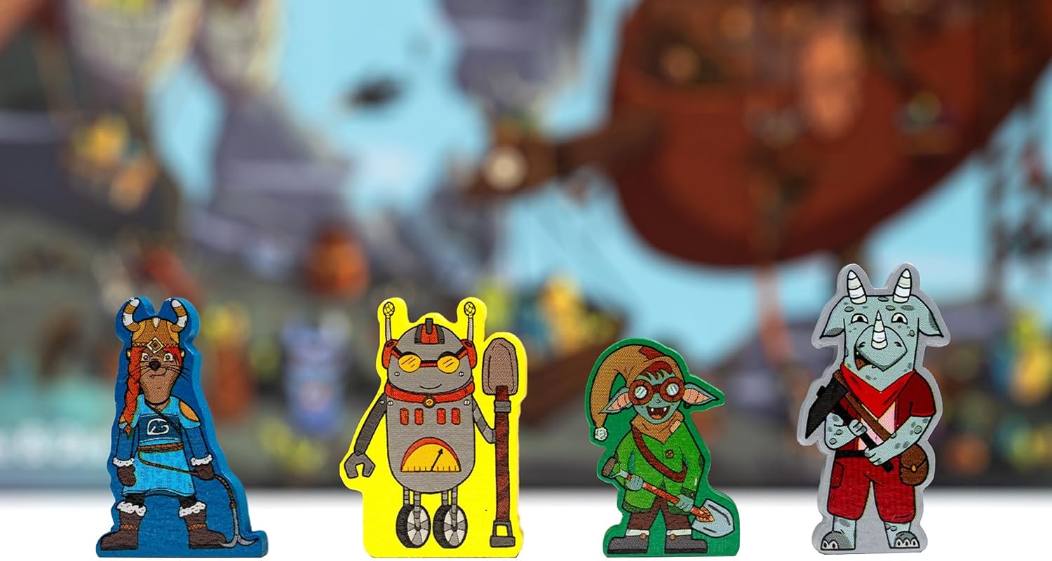 Explore Iridescia by flipping over land tiles, revealing the gems hidden beneath them, and then roll dice to mine them. Each gem color is tied to a dice value that can be manipulated to help your cause. Roll high enough, and you can claim more gems, adding them to your cargo hold, providing you with a valuable resource for restoring relics and scoring royalty points!