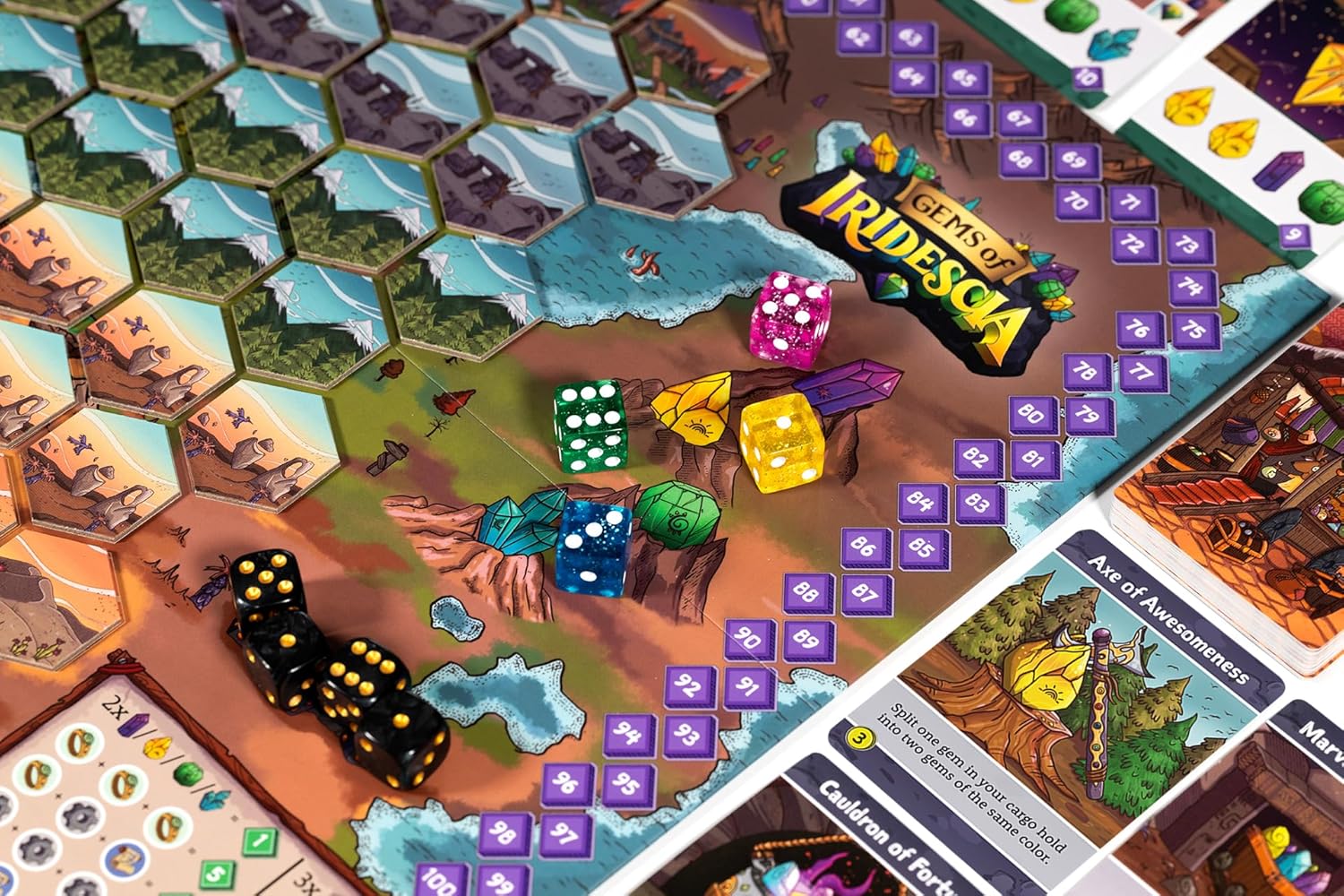 Gems of Iridescia is a worker-placement board game in which players will push their luck as they compete to mine gems, restore ancient relics, and ascend to the throne of a rich gem-filled world. Secret objectives and a variety of ways to score create different paths to victory, making every expedition a unique experience.