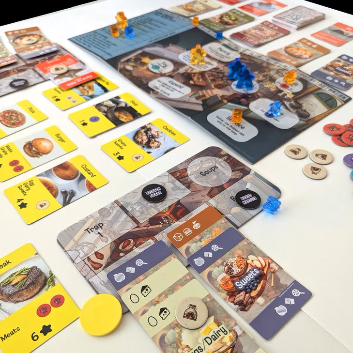 Kitchen Chaos is a chaotic cooking board game with traps! Chefs race around the kitchen gathering ingredients, preparing dishes, making recipes, and setting traps to become the best chef in the restaurant! The chefs must fight over limited cooking stations while planning devious traps to set upon their opponents. Be careful as your opponents will also be setting traps upon you!