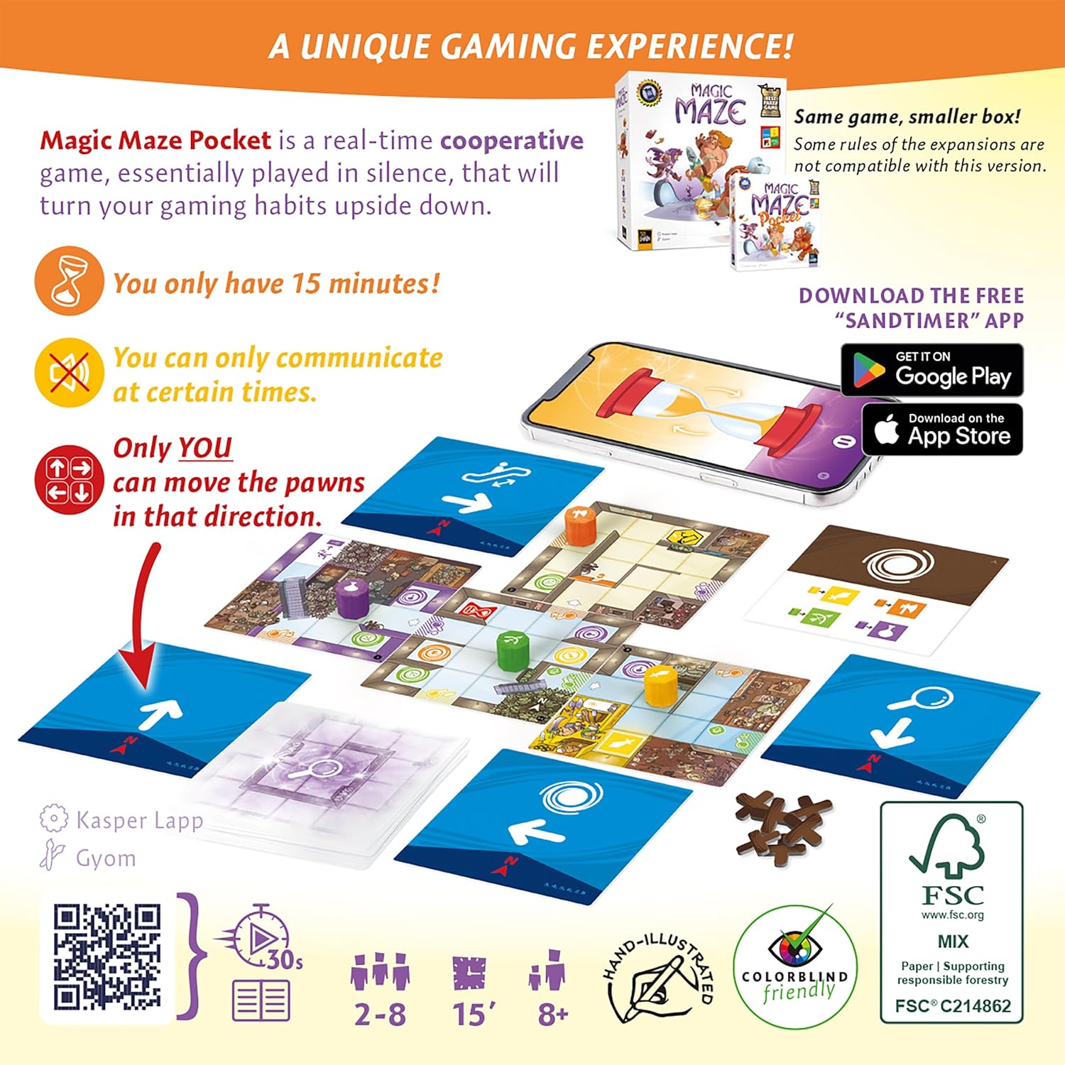 Magic Maze is a real-time, cooperative game. Each player can control any hero in order to make that hero perform a very specific action, to which the other players do not have access: Move north, explore a new area, ride an escalator… All this requires rigorous cooperation between the players in order to succeed at moving the heroes prudently. However, you are allowed to communicate only for short periods during the game; the rest of the time, you must play without giving any visual or audio cues to each other. If all of the heroes succeed in leaving the shopping mall in the limited time allotted for the game, each having stolen a very specific item, then everyone wins together.