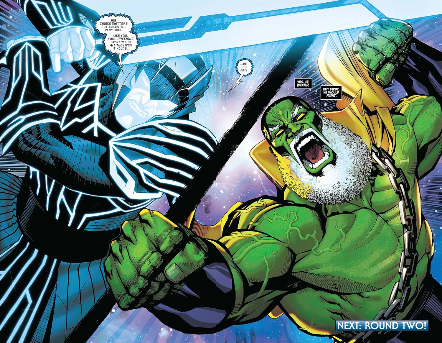 In a dark future born from the choices of today, all of time and space is threatened by an ancient evil’s ascension. The Moon Knight Unending has risen — a nightmare born of StarkTech, the Eternal Machine and the God of the Moon — and now all of Earth bows before his overwhelming power! But one man stands against Khonshu’s coming tide of chaos: Power Man, the Marvel Universe’s final living super hero! He is unstoppable. Indestructible. Incorruptible. Immortal. A Gamma-powered, Iron-Fisted, Sentry from the future — but what happens when this timeless Luke Cage arrives in the modern Marvel Universe? Can you believe he will discover a foe, and a mystery, that will challenge even his incredible abilities? But what brings Aeon the Knife to the Milky Way? And can Power Man stop him without letting the Void loose?