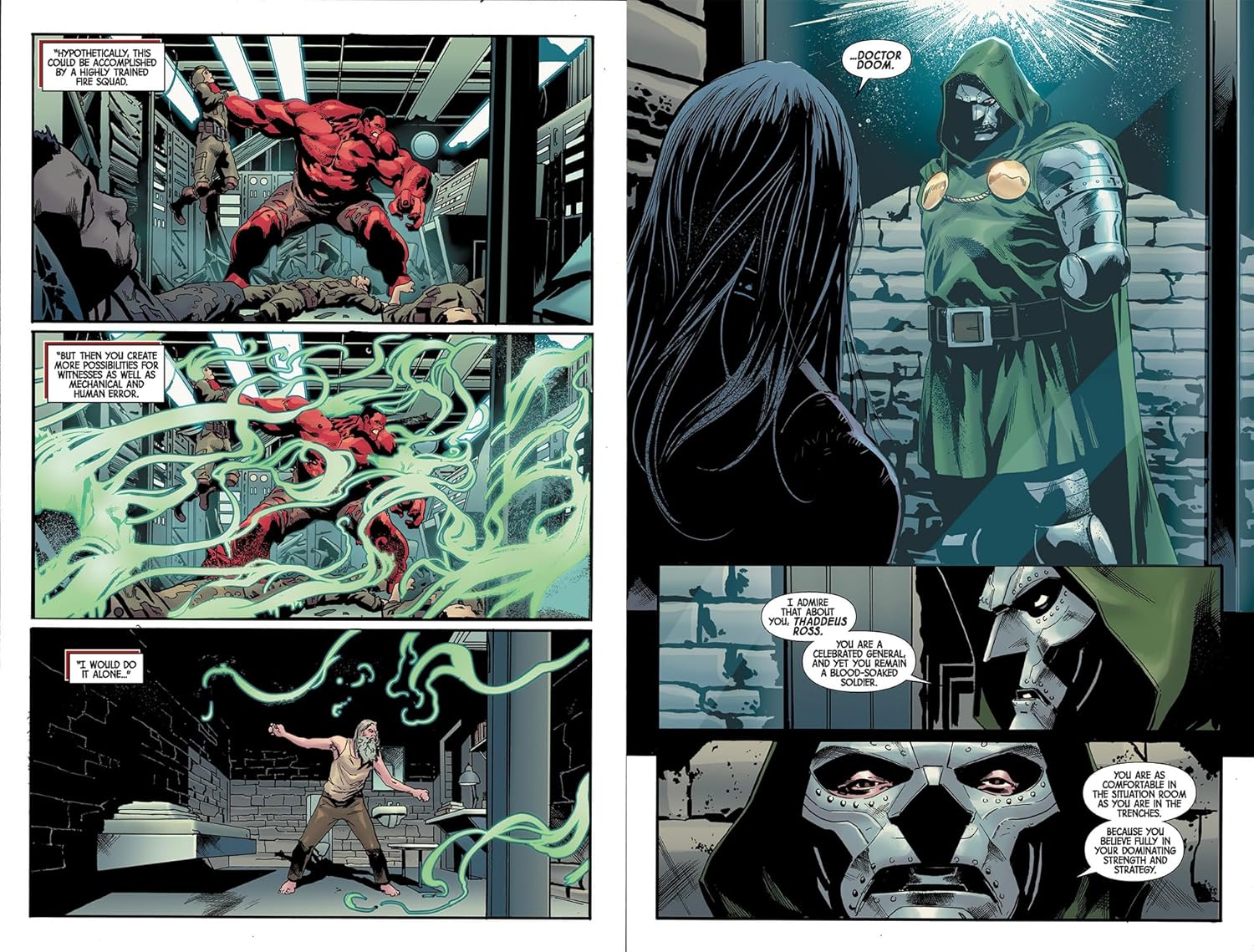 Thunderbolt Ross is buried in a cell deep below the ground as a prisoner of Doctor Doom — and he’s not alone. Brilliant military, criminal and political minds have been gathered against their will in a prison complex that serves as a “think tank” to help carry out Doom’s plan for global domination. But the Red Hulk has other plans! Ross has been underground for so long, though, that his powers are fading. He’ll need the assistance of the misfit crew of Machine Man, Deathlok and General Simon Ryker if he’s going to outsmart and outmuscle the legion of Doombots that are after them.