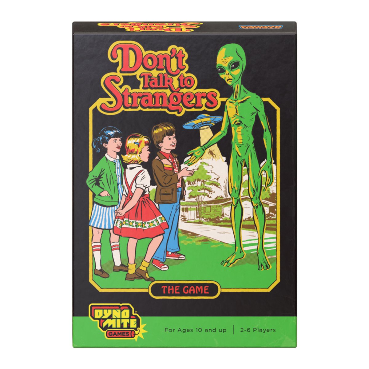 Don't Talk to Strangers starts when school lets out for the day and mom dad haven't noticed yet, but strangers are popping up everywhere! These strangers are really strange -""from another planet"" strange! Each turn you'll play a new movement card in order to navigate your kids - one at a time - from the starting school space, across the board to a ""scoring space"", that's both safe from aliens and a fun way to waste the afternoon!